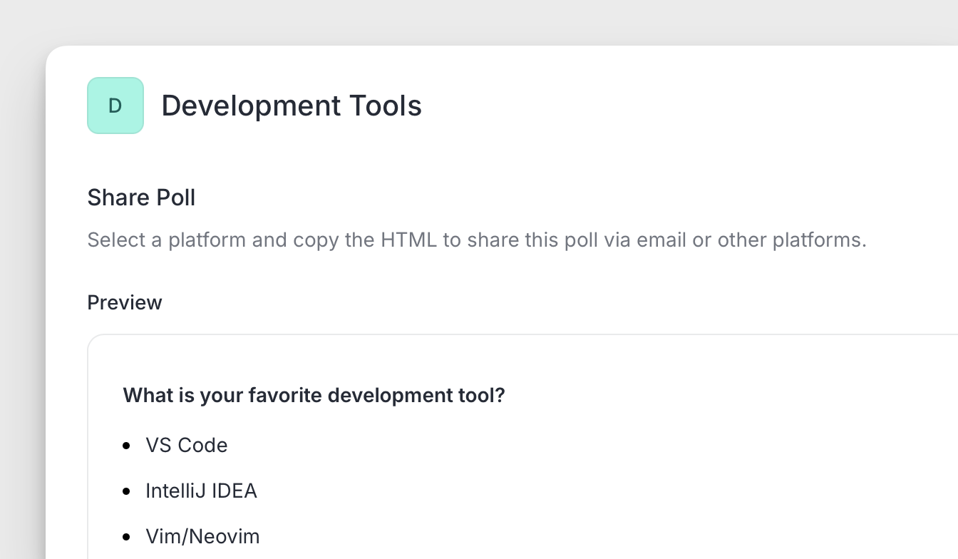- Share polls with a dedicated sharing page featuring rich text clipboard support