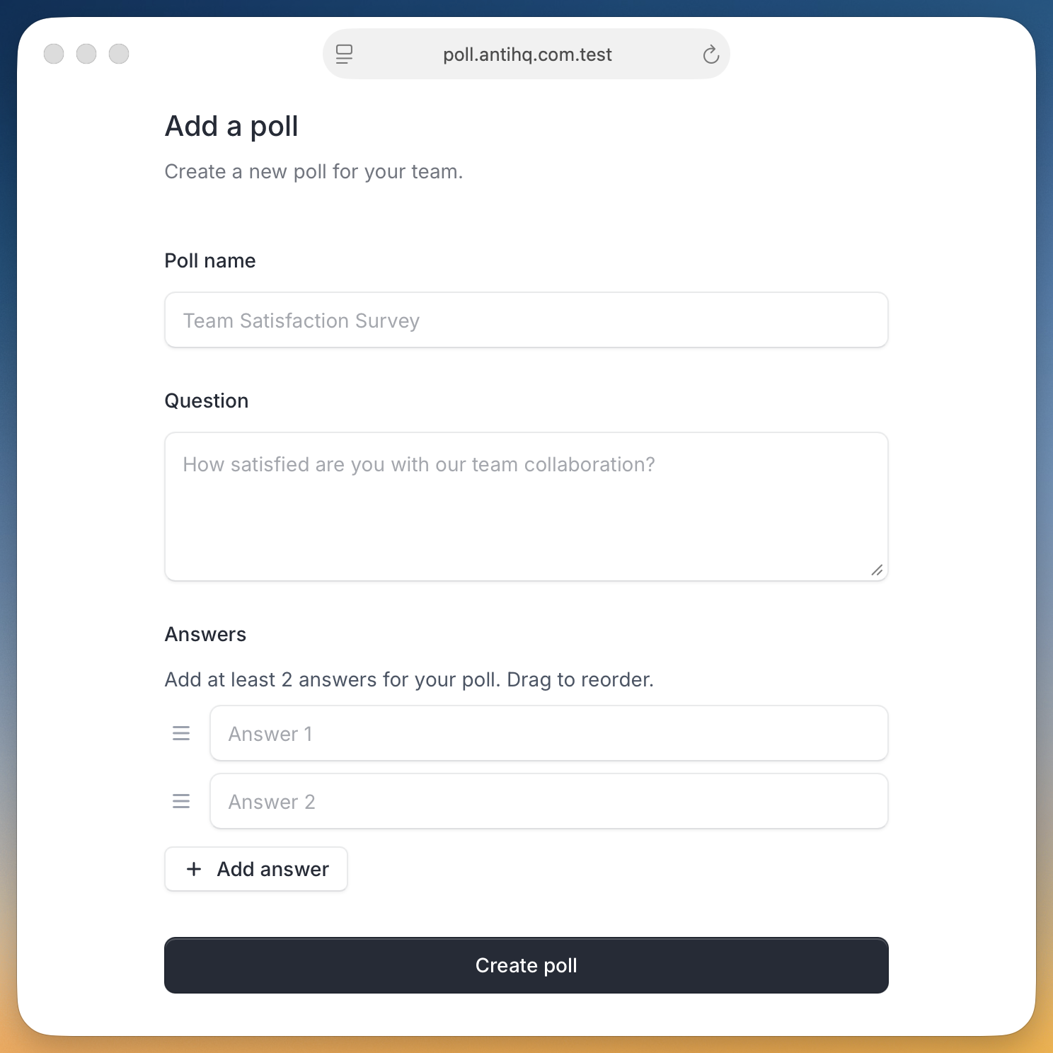 Creating polls is straightforward and flexible. From the dashboard or polls page, click