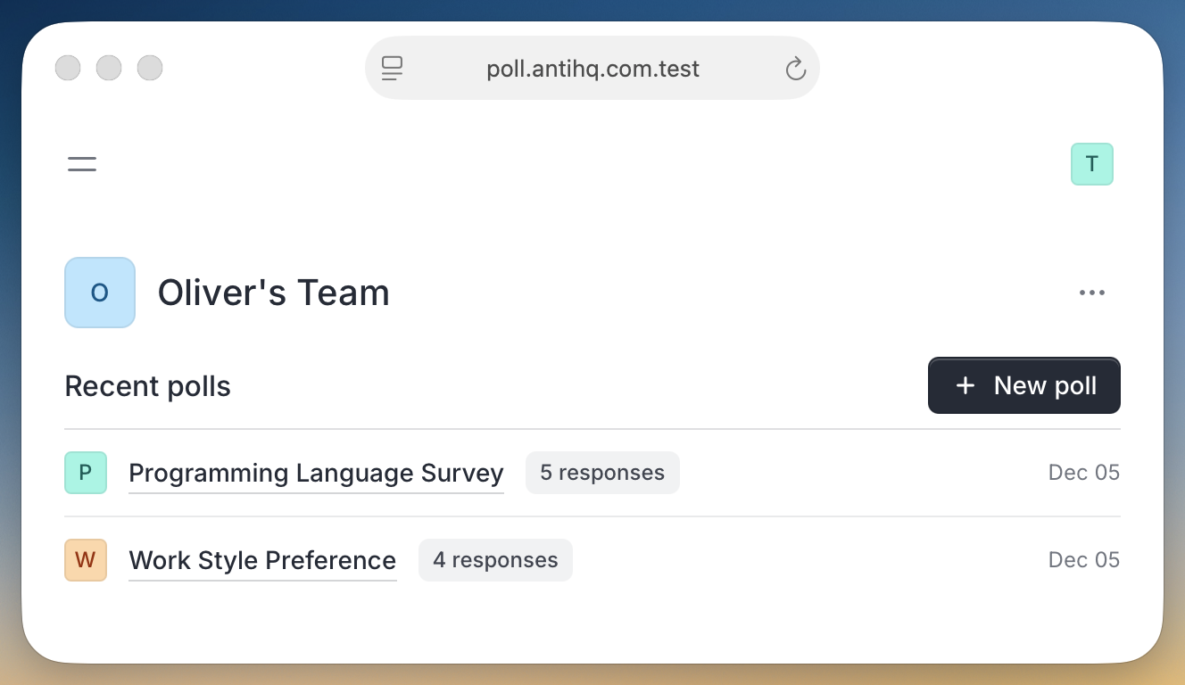 From the dashboard, you can quickly create new polls, view existing ones, and monitor response activity. Each poll displays its name, response count, and creation date for easy reference.